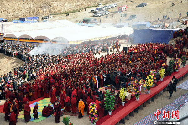 来自玉树各地的近万名群众、僧人前来参加,寄托哀思。(图:胡贵龙)