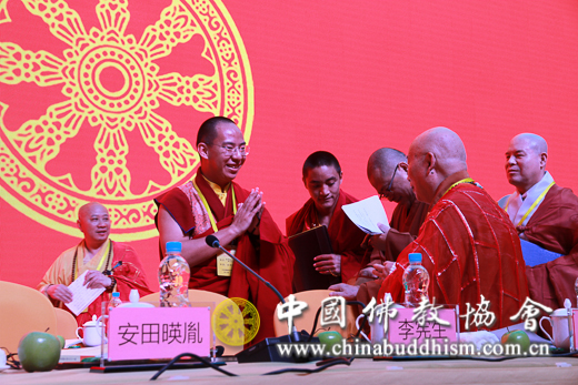 安田暎胤长老在致辞中说,日本东部大地震发生之际,中韩两国政府和社会各界向灾区提供了无私的物质援助和宝贵的精神支持,对此,我们感铭肺腑。新时期,日中韩三国佛教徒更应该同心协力,为维护、促进世界和平,进一步加深和巩固赵朴初先生倡导的日中韩三国佛教“黄金纽带”关系而努力。