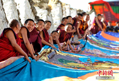 楚布寺僧人在展佛台上展开巨幅唐卡