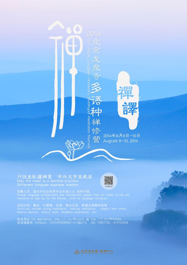北京龙泉寺翻译中心将于2014年8月8日至10日于北京龙泉寺举办 “多语种禅修营——禅译”。活动内容包括静坐、行脚禅、农禅、佛法交流、慈善及佛事体验等。欢迎国内外社会各界专业外语人士报名参加,语种不限。本活动寺内全程免费。