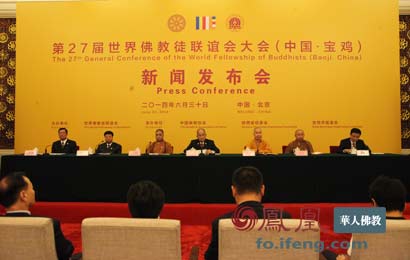 凤凰网华人佛教北京讯:2014年6月30日下午,第27届世界佛教徒联谊会大会新闻发布会在人民大会堂北京厅举行。“世佛联”秘书长攀洛•泰阿利先生,中国佛教协会副会长、陕西省佛教协会会长、第27届“世佛联”大会陕西省组委会副主任增勤法师,中国佛教协会新闻发言人普正法师、明杰法师,宝鸡市组委会副主任张敬原先生介绍了大会筹备情况并回答了记者提问。