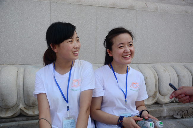 在大佛台上,我们随机采访了几位同学。当问到她们累不累时,大家都说还好,虽然天气炎热,腿有点不适,但坚持更有意义。小曹同学说:“开始时有些累,但后来就不那么累了,因为心慢慢平稳下来。”“对拜佛有什么感受?”针对提问,小李很认真地回答:“心灵得到了净化,也加深了对佛法的理解。”然后,她们谈到了来夏令营每天都有收获,并举例说,在大寮洗碗让她们感受很深,看到大家那么发心,有效率,还有许多老义工认真投入的身影,她们体会到什么叫“默默欢喜的付出。”当问到她们,这次夏令营生活会对自己将来的人生有什么影响时,她们俩很自信地回答:“做好自己,遇事多为他人着想,种善因,才能收获善果”。