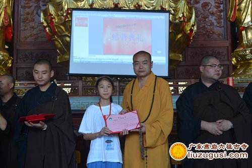 在此次夏令营活动快结束的时候,由澳门普善佛教慈善会副会长、澳门普善佛堂住持、广东燕岩六祖古寺住持宽静大和尚给孩子们颁发奖状和结业证书,并与孩子们合影留念,此次夏令营完美落幕。