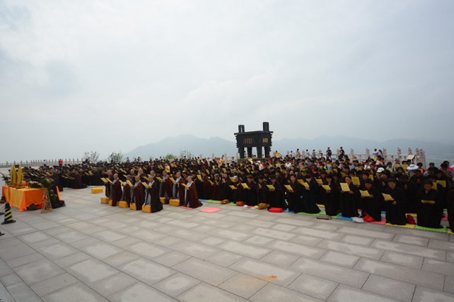 2014年6月29日清晨,阴雨多日的天空初绽丽阳,金色的阿弥陀佛圣像在蓝天白云的映衬下,显得格外地庄严相好。来自山东济宁、台儿庄、薛城、微山湖等地的缁白二众560人,在东林寺慈善护生会慧悦法师的带领下,来到东林寺净土苑朝礼大佛,并在大佛台前举行一场诵经祈福法会。