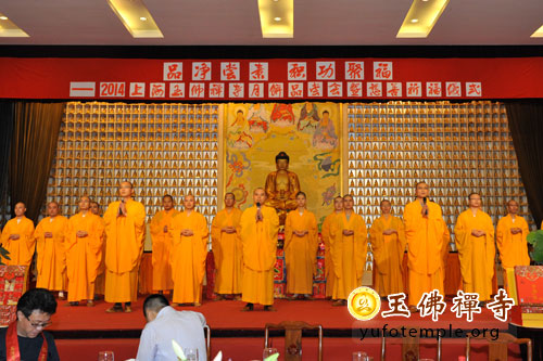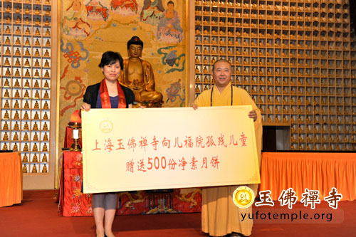 今天同时也是玉佛禅寺月饼品尝会举行的日子。在新歌发布会后,“品净尝素,积功聚福——2014上海玉佛禅寺月饼品尝会暨慈善祈福仪式”在觉群楼多功能厅举行,来自上海各界的代表人士约200余人参加。玉佛寺梵乐团在品尝会上表演了自己创造的节目,与会文艺界的知名人士也上台即兴表演,为整个品尝会增添欢乐的气氛。会上,觉醒大和尚代表玉佛禅寺,延续往年的传统,向上海市老年基金会、上海市慈善基金会和上海市儿童福利院捐赠月饼4500余份。