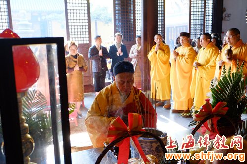 10时35分,龙华古寺方丈首座海晏长老登临三圣宝殿,拈香主法,率领十位法师执持法器,高唱佛偈,颂扬三宝,赞佛功德,为泰王诵经祈福。