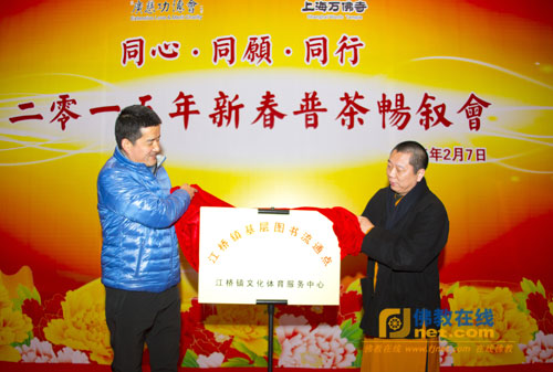 日前,万佛寺图书馆被列为江桥镇基层图书流通点。借此次新春普茶会的机会,举行了江桥镇基层图书流通点揭牌暨授书仪式。中共江桥镇委员会副书记魏晓栋先生与慧禅法师共同为图书流通点揭牌。