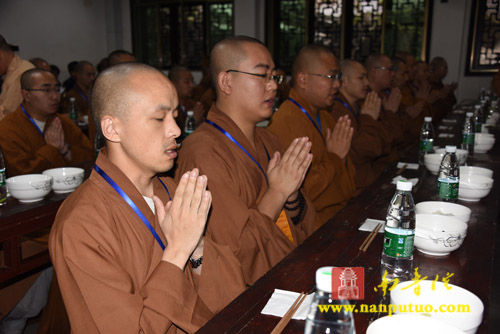 中午11时许,参学团一行来到曹洞宗祖庭南台寺朝拜并过堂。用斋毕,湖南省佛教协会秘书长、南岳佛教协会会长、南台寺方丈怀辉法师为同学们介绍了恩师宝昙老和尚的生平,鼓励学僧,要护持常住,维护三宝,严守清规,弘扬圣教。界象法师说:“南台古寺,祖师倍出,善才童子五十三参,南岳每个道场各有家风,都是我们学习的地方。走到哪里都有闽院校友,要感恩学院给我们创造的平台;同时也要利用这个平台更好的弘扬佛法才是真正宗旨和目的。”随后,同学们登上安奉佛陀舍利的九层金刚舍利塔,至诚顶礼诵经,赞佛发愿。