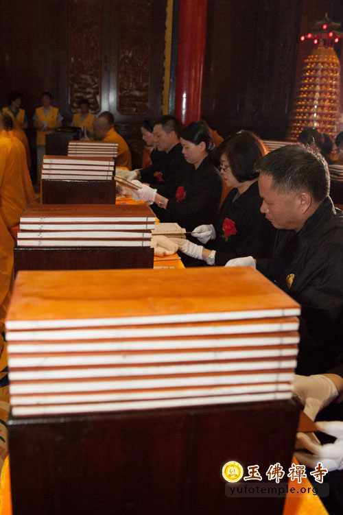 简短的法会仪式过后,法师、居士在工作人员的配合下,把玉佛禅寺珍藏的经书请出,细心除去灰尘,并轻轻翻动防止霉变与虫蛀。藉此表达对佛陀教法,特别是“法宝”的敬重之情。