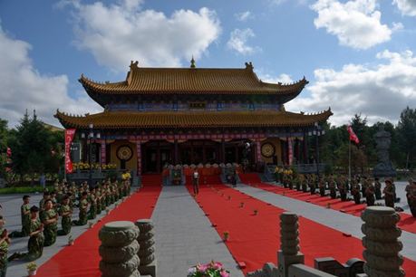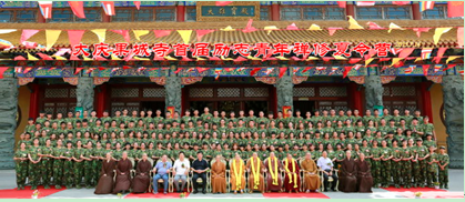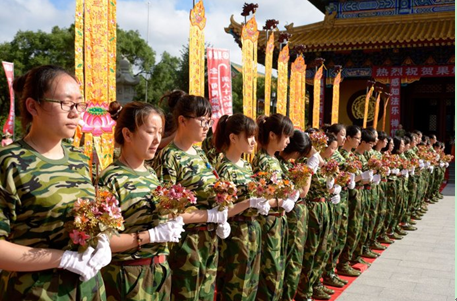 上午9点,青年学子身穿统一迷彩服安然有序地来到三圣殿,平静安详地等待嘉宾和领导亲临现场出席开营典礼。在学子们的热烈掌声中,领导嘉宾们陆续入座。