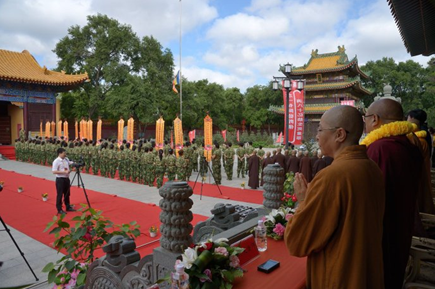 迎请结束后,学员们整齐列队在天王殿前。庄严的国歌和神圣的三宝歌萦绕在整个寺院上空,国旗和佛旗冉冉升起,学员们心中充满了拳拳爱国之情和切切修道之心。他们在心中暗自发愿,一定要为国旗增辉,为佛旗添彩,为社会做出年青人应有的贡献!