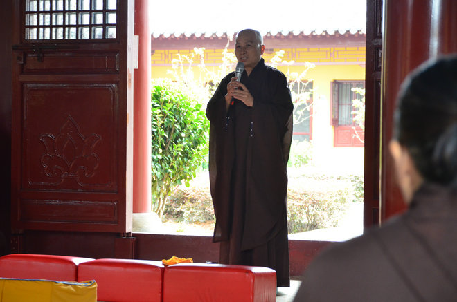 最后,德天法师为大家做了总结性的开示。德天法师首先肯定了大家的闭关收获,并再次为大家讲解了净土法门的纲宗:真为生死、发菩提心、以深信愿、持佛名号。德天法师特别指出,净土法门的菩提心与通途法门不同,它并非高不难攀,而是非常平实。只要我们能发起厌离娑婆,欣求极乐的心,并回向一切众生同生极乐,就是大乘菩提心。德天法师强调在持名中要仰靠弥陀大愿的加持,做到信、愿、行三者有机结合。最后,德天法师问大众,当前地球上什么地方离极乐世界最近?有居士回答:东林祖庭是人间净土,离极乐世界最近。德天法师慈悲开示说:离极乐世界最近的地方就在每个人当下深信切愿的心中。德天法师鼓励大家离开祖庭后,也要时刻精进念佛,深信切愿,时时不忘心中的极乐故乡!