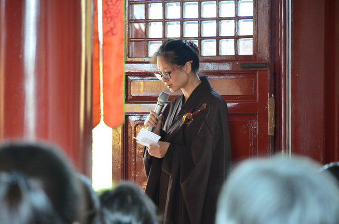 接下来,大家分享了闭关期间的心得体会。首先是一位来自台湾的比丘尼师父发言。本次闭关,这位师父勇猛精进,完成了24天的念佛。比丘尼师父分享说:自己年过半百,才找到生命意义所在,毅然决定出家修道。出家后,由于忙于寺院大小事务,却一直无暇修行。这次从台湾到大陆参访,慕东林祖庭道风,幸运得到了一个宝贵的闭关机会。在24天中,自己坚持念清楚、听清楚的原则。前几天一直被昏沉、妄念缠绕,佛号很难得得力。此刻,内心深处升起了很强的惭愧,在这种力量下,发起了大精进心,慢慢克服了种种障碍。第八天后,开始逐渐感到明显轻安。随后十几天中,感到通身已被阿弥陀佛的慈悲愿力包围,佛号相续不断,非常有力。出关后,这位比丘尼师父再三感恩上大下安大和尚和东林寺常住,同时发愿回台湾后,带领当地信众精进念佛,求生极乐,让东林佛号在宝岛台湾上空回荡。
