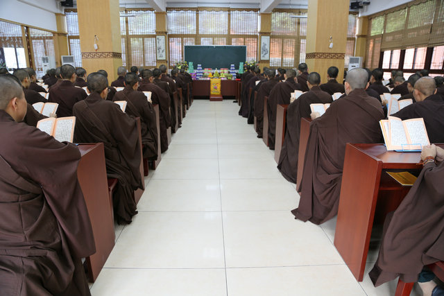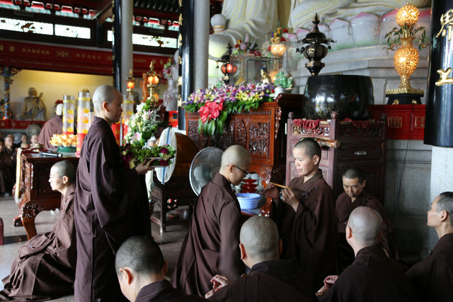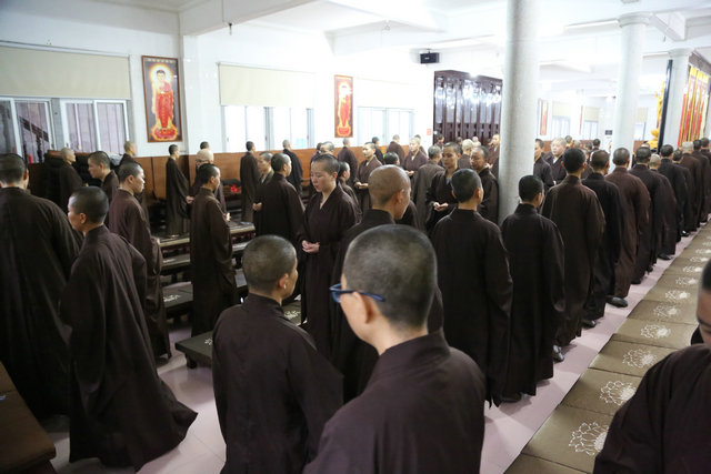 安居受筹 2015年8月27日(农历七月十四日)上午7时45分,广东陆丰定光禅寺、广东尼众佛学院秉依律典,谨遵佛制,举行受筹作法仪式,由佛学院悟道法师主法。佛学院部份师生、常住大众共集大雄宝殿内行受筹仪式,以此八功德水来洗涤贪嗔痴三毒烦恼,欲令大众不懈身心,继续精进用功办道。 行筹的时候,第一根筹敬给本师释迦牟尼佛,表示佛的法身也跟僧团一起安居,摄持僧团;最后一根筹敬给护法韦陀菩萨,表示韦陀菩萨一起参加安居,护持僧团。九旬之中,大众精进办道,加功用行,半月布萨、诵经、念佛、听法、学戒、出坡等,摄静身心,如法行持,法喜充满。今年受筹座中比丘尼115人,式叉尼13人,沙弥尼5人,总人数为133人。 九时许,在庄严的回向声中受筹作法仪式圆满结束。 |