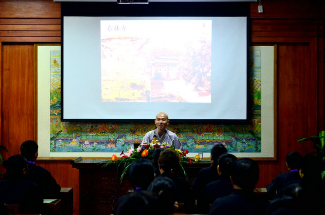 10点,学员们来到观音殿二楼教室,首先同声恭唱《三宝歌》,随后聆听了本次活动的第一堂课——德一法师主讲的《东林寺的历史与净土文化》。德一法师开示说,东林寺秀挹庐山,钟灵毓秀,历史悠久,文化底蕴深厚,自东晋年间慧远大师开山至今已有1,600多年的历史。昔慧远大师以其睿智卓识将东林寺发展为当时南方的信仰与文化中心,复与诸位高贤建斋立誓,启建莲社,遂使东林寺成为我国第一净土道场,流风余韵,影响深远。历代文人贤士与东林寺多具胜缘,留下了数不清的雅事鸿影,诗词华章。德一法师继而勉励学员们说,净土法门为浊世津梁,胜异方便,大家当放下尘缘,打开心量,在祖庭虔心领受奉行净土文化,为最终解脱生死打好基础。