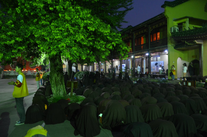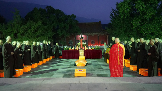 傍晚时分,明月初现,拜月台上香果累累,“南无月宫太阴尊天菩萨”牌位已竖立案前。6时30分,香烛供灯点亮,引礼师鸣磬击法鼓,缁白二众千余人于月下肃然静立。东林寺方丈大安大和尚莅临拜月台前,主持拜月法会。大和尚虔诚拈香,恭请太阴尊天菩萨降坛,随后大众同诵《药师琉璃光如来灌顶真言》。唱诵毕已,僧众分东西两单拜月,维那举赞曰:“云开空净,独露婵娟,皎洁无暇体自圆,一月一周天,普照无边,恩泽被大千。”皓月当空,秋风习习,万里清辉之下,缁白二众诚祈太阴尊天菩萨赐福人间,普愿清凉甘霖遍洒之处,容摄大千芸芸众生,免受贪、瞋、痴热火逼恼,安获吉祥。