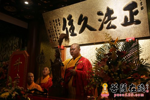10时,本寺天王殿、钟楼、鼓楼、大雄宝殿、圆通宝殿圣像开光同时进行。法会由中国佛教协会副会长、玉佛寺方丈觉醒大和尚,中国佛教协会副会长、江西省佛教协会会长、南昌佑民寺方丈纯一大和尚,中国佛教协会副秘书长、上海市佛教协会会长、静安寺方丈慧明大和尚,中国佛教协会副秘书长、浙江省佛教协会副会长、杭州市佛教协会会长、灵隐寺方丈光泉大和尚,上海市佛教协会名誉会长、真如寺法主妙灵长老,上海市佛教协会副会长、法藏寺住持光慧法师,本寺方丈灵宏大和尚等数十位大德法师共同主法。开光仪式、如理如法,高僧大德唱赞佛偈。主法法师拈香、说法,杨枝甘露,遍洒三千。“用巾拂尘”,现执此巾,佛去尘埃,真性显现;“举镜照空”,持此大圆镜,光明遍十方;“朱笔点眼”,笔点开六根,互摄互融,当起妙用。