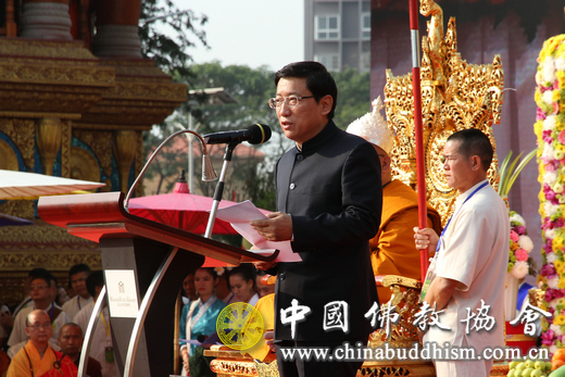 在全国人民正沉浸在新春佳节欢乐气氛的吉祥日子里,我们相聚在美丽的西双版纳举行帕祜巴和帕松列升座庆典法会,真是因缘殊胜、法喜充满。在这个庄严的时刻,我谨代表中国佛教协会向祜巴龙庄勐晋升为帕松列龙庄勐,向西滴看堂、玛哈香、都香、都炳、都罕听晋升为帕祜巴表示热烈的祝贺!向前来参加庆典法会的海内外各位嘉宾表示新春的祝福和诚挚的问候!