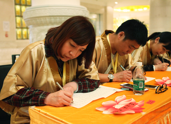 法场寂静,施主们十分专注,心如止水,一笔一划皆如禅,快乐和智慧慢慢地潜入心中来。