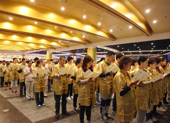 3月26日,瑞彩祥云,和风拂面,海上观音道场人头攒动,香火旺盛,香客们纷纷在这殊胜的日子前来上香祈福。下午19:30,圆通宝殿内慧灯通明,梵乐吉祥,参加法会的施主依次落座,开启殊胜的抄写供灯祈愿文活动。
