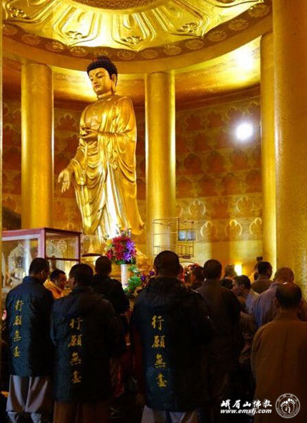 离开灵觉寺,经过接引殿,百人团来到了金顶华藏寺,用完午食后,佛学院的悟华法师为大家介绍了金顶华藏寺的概况和十方普贤圣像,妙德法师和普文法师给大家详细讲解了普贤菩萨的普皆回向愿。