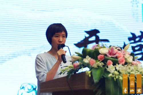 秋爽大和尚为2016“和合·国学”夏令营授营旗,苏州和合文化基金会秘书长顾轶群女士接受营旗。