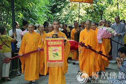 上午九时三十分,迎请仪式在大雄宝殿举行,重庆华岩寺僧众以及与会领导嘉宾信众齐聚大雄宝殿前迎请方丈道坚大和尚。沿途信众手持鲜花,纷纷鞠躬、合掌致敬。道坚大和尚引领信众拈香礼拜,而后洒净前往观音院。