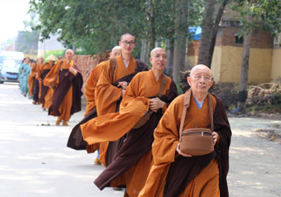此次第二届阅藏七法会恰逢佛教史上冬参夏学之结夏安居最后七日时间,天宁寺解夏临近,诸师遵循佛制,秉承祖师遗教,每日午时托钵乞食为周边村民广种福田,宿值德本,僧众托钵乞食,化度十方,为佛教托钵乞食制度续写历史篇章,深受周边善信拥护爱戴,同时为阅藏七法会增添新绿,把浓郁的佛教色彩弘化到世间。