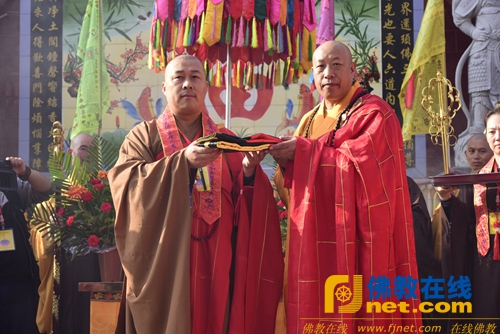 由陕西普渡寺住持圣吉法师为延菩法师送位,深圳弘法寺监院智法法师代表弘法寺印顺法师为菩提寺开山延菩法师送座,说偈语云:一佛出世,千佛护持,延菩升座,道场增辉。延菩法师合掌答云:依教奉行,将此身心奉尘刹,是则名为报佛恩。