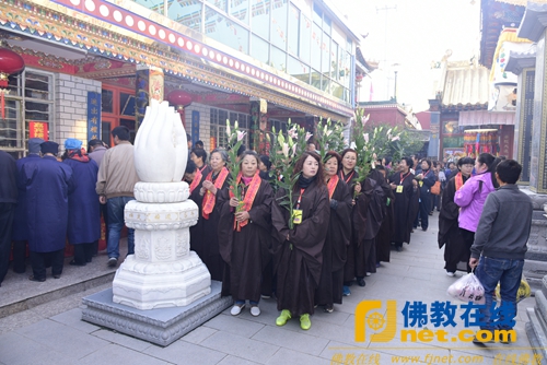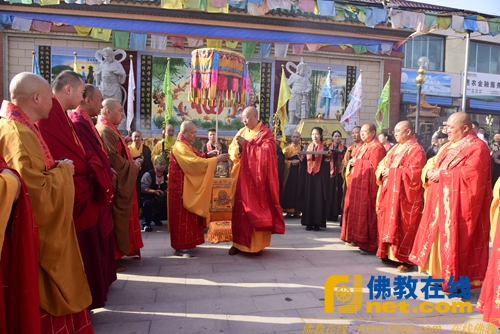 上午九时许,在菩提寺山门前,来自国内及青海省内各寺院的住持和尚,给菩提寺开山延菩法师在菩提寺山门分别授衣、授钵、授挂珠、授具,授佛教法器如意、锡杖、拂尘、龙杖、钵及俱等,后随着四众弟子幡盖仪仗队迎请延菩法师绕寺一周至山门前,龙杖卓地说法语云:此是禅门选佛场,慈悲喜舍四无量,我今沐恩登法门,重拈灵山一柱香。