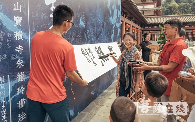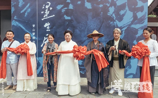 6月29日,来自中、日、韩三国的艺术家,曹山宝积寺住持养立法师,以及禅意书画展作者朱德玲共同为展览剪彩。朱德玲在展板前欣然挥毫,并与艺术家合影留念。