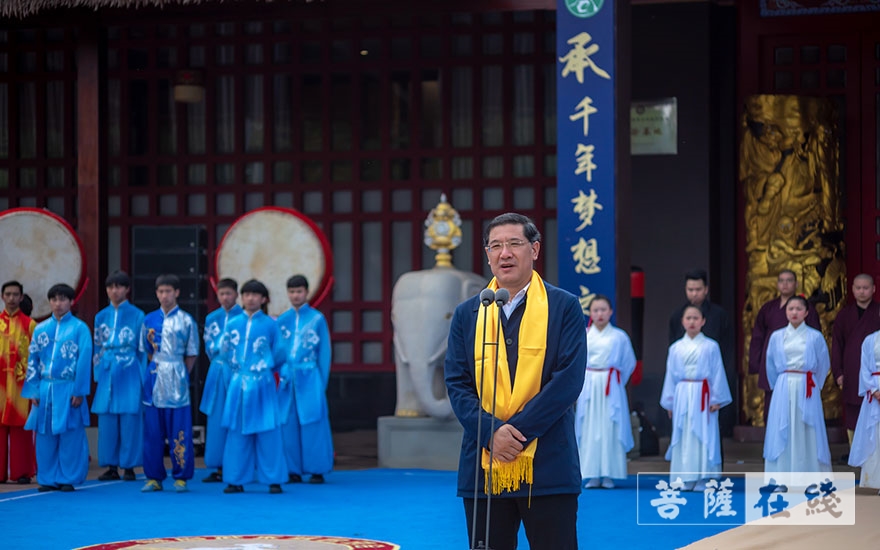 通达法师恭读祭文,文曰:“峨眉武术,名扬千古。初祖司徒,厚德无量。肇始战国,开辟鸿蒙。拳号通臂,播迁九域……传承武术,我辈担当。光耀先祖,雄风远扬。昭告我祖,佑我家邦。祭礼大成,伏惟尚飨。”