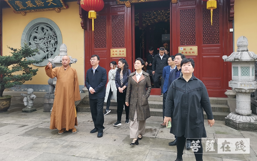 菩萨在线浙江讯 4月25日上午,沈阳市委统战部副部长、工商联党组书记金翔,沈阳市委统战部办公室主任杨书勇,沈阳市和平区委统战部常务副部长杨艳丽,沈阳市铁西区委统战部常务副部长朱春红,沈阳市委统战部政研室四级调研员郭靖时一行5人赴绍兴龙华古寺考察调研宗教活动场所规范化管理工作。