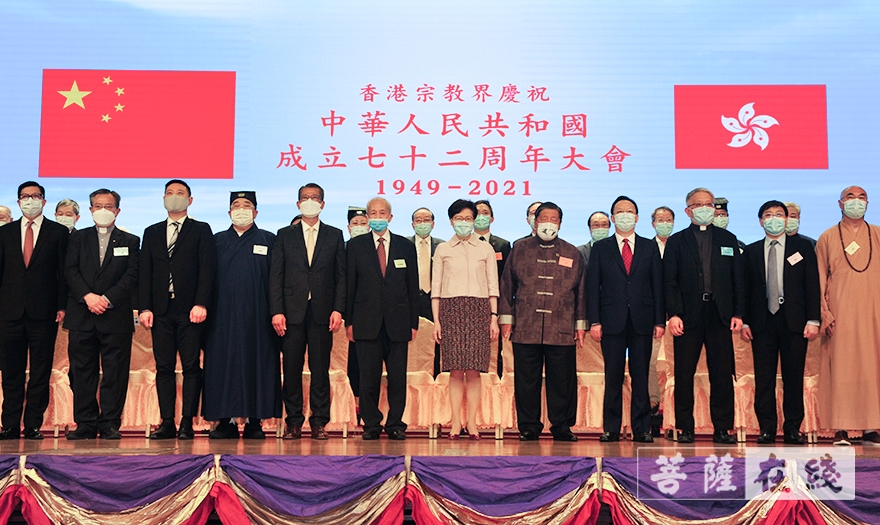 菩萨在线香港讯 9月14日,香港宗教界举行庆祝中华人民共和国成立七十二周年大会,香港特别行政区行政长官林郑月娥、中央人民政府驻香港特别行政区联络办公室副主任谭铁牛出席会议,并与各宗教领袖、代表,共同向国家送上真诚祝福。