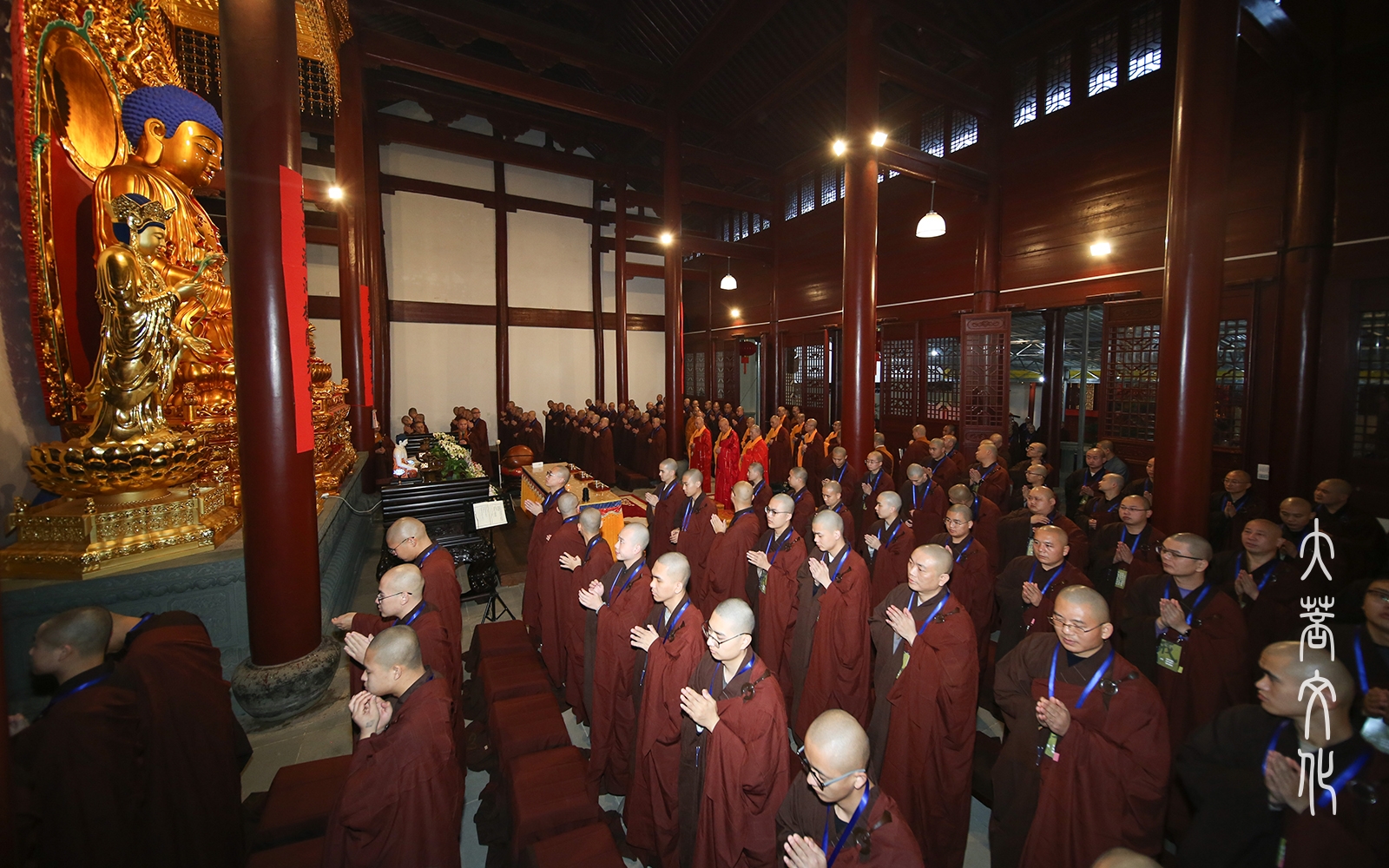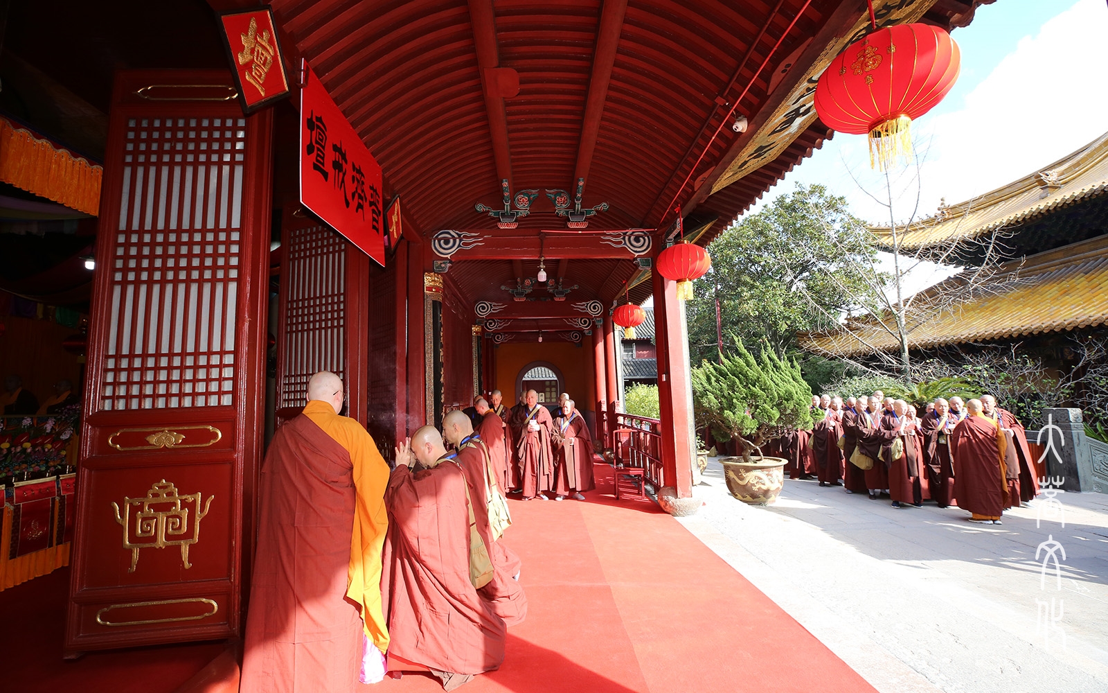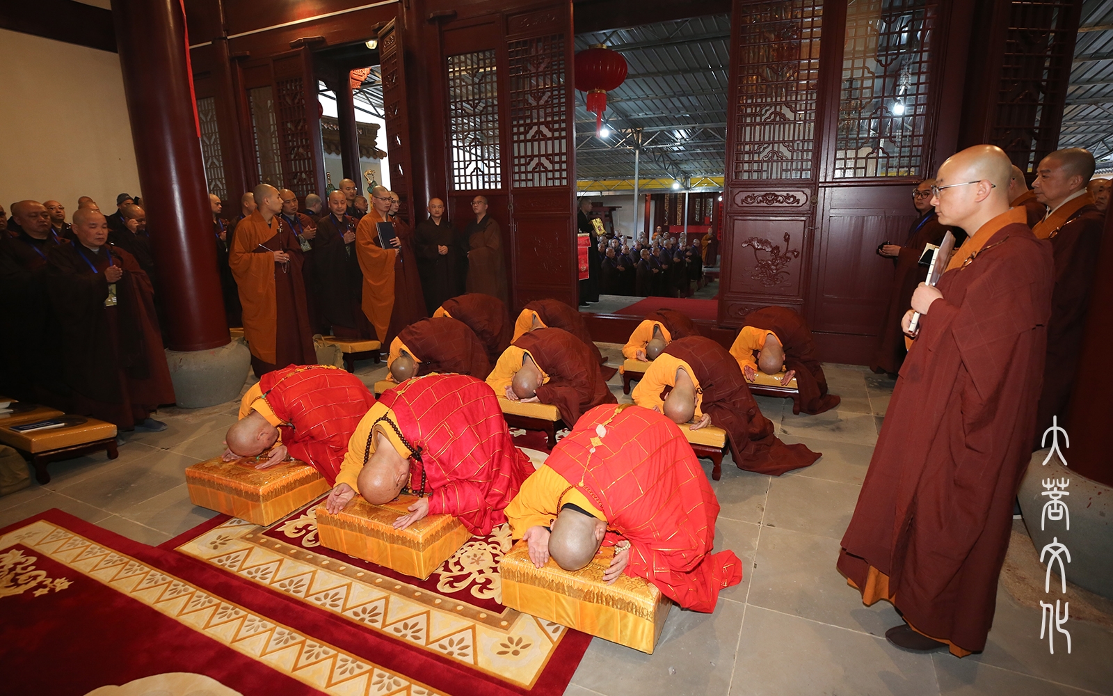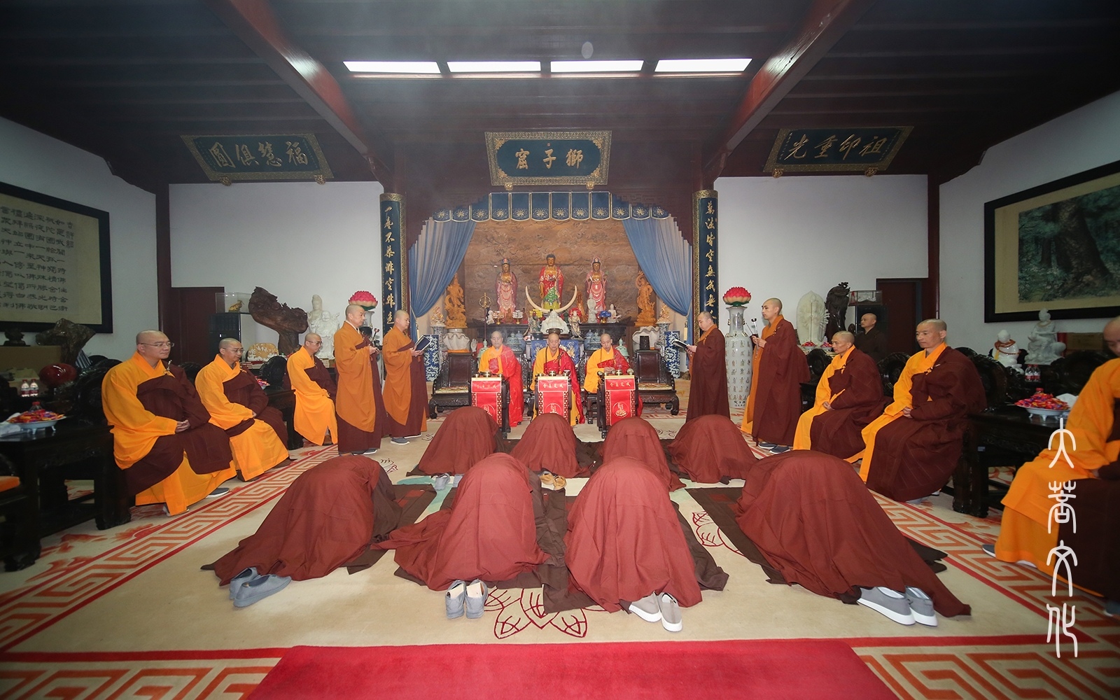 新戒比丘下坛后,分班集结,在引礼师父的带领下礼四圣(韦驮菩萨、伽蓝菩萨、监斋菩萨、祖师菩萨)。