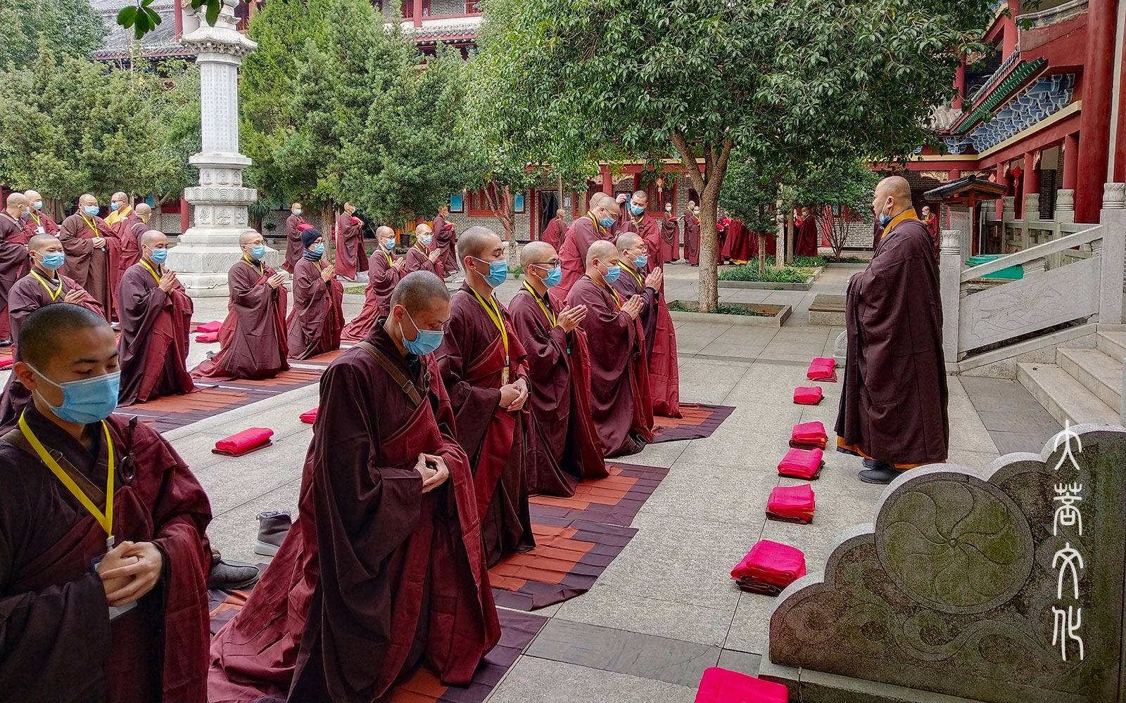 在引礼师的带领下,新戒有序排班,迎请三师至戒堂。新戒至诚顶礼三拜,长跪合掌,请戒开导,三师慈悲应允。