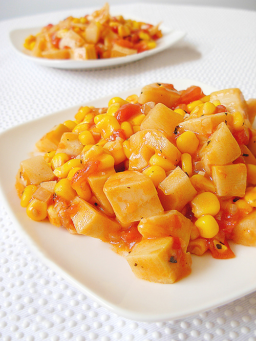 材料:西红柿两个去皮切丁;袋装笋焯水后滤干;甜玉米粒;盐、糖、素