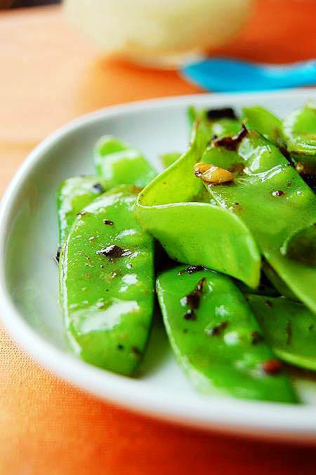 1、嫩荷兰豆撕去老的筋膜,洗净