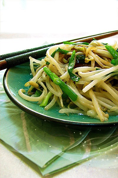 3:加入豆芽翻炒1分钟左右,出锅前加入少量的盐和蘑菇精。