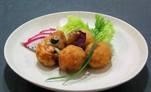 5. 先放油热锅,再将作好的丸子沾上炸粉后下锅炸成金黄色即可。