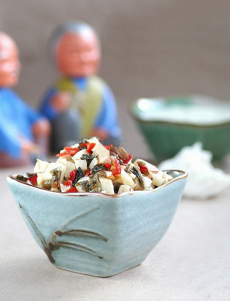 2)大火加热炒锅中的油,待油6成热的时候调成中火,爆香后倒入冬笋丁煸炒2分钟,再加入剁椒和雪菜。