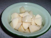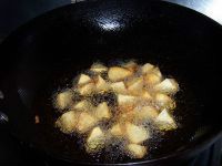 7.土豆下入油锅炸至表面结痂,用筷子能够扎透。捞出沥油。