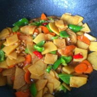 6. 土豆片、胡萝卜片下锅翻炒
