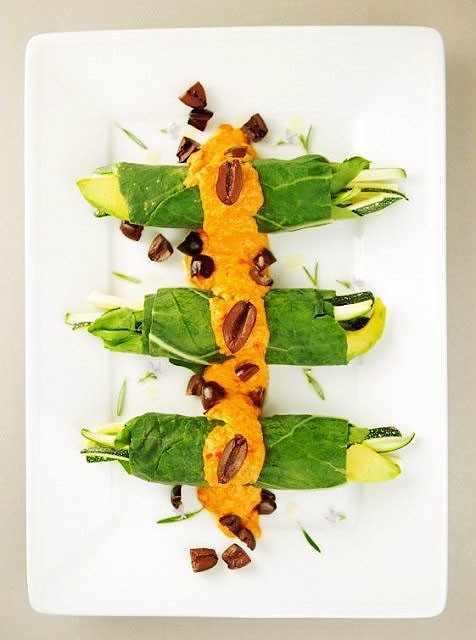 大甘蓝叶片上依序放一些菠菜,勺些红辣椒豆沙,放上鳄梨,西葫芦和黑橄榄,小心卷成粗卷即可。表面淋上红辣椒豆泥,碎橄榄装饰。