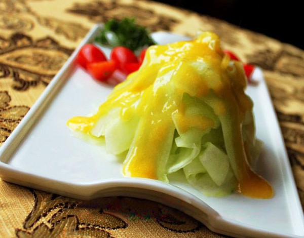 3、将做好的香芒汁淋在做好的瓜柳上即可。