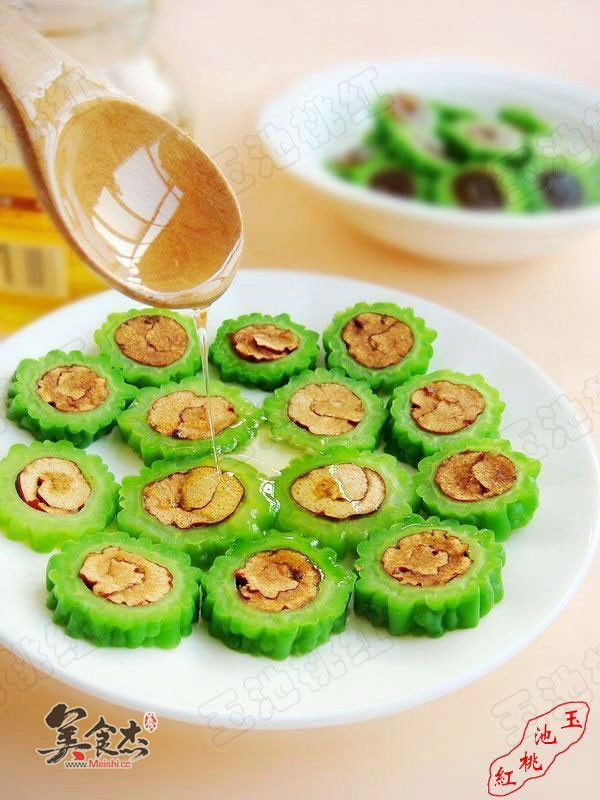 第4步将去核的红枣卷起来塞进苦瓜里面,再切成薄片,淋上蜂蜜或浓稠的果汁即可