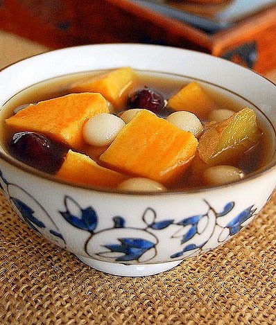 【用料】 地瓜300克、老姜20克、去核红枣10颗、糯米小圆子50克、水适量、红糖适量