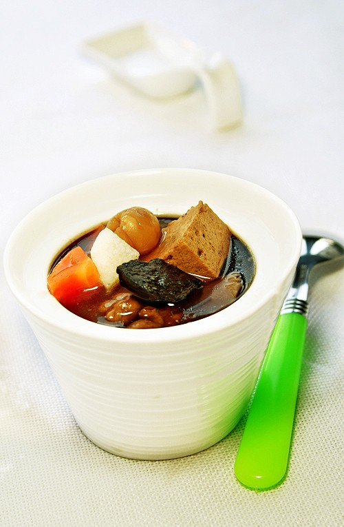 9.取炖盅,放入制何首乌、核桃仁、桂圆肉、素腓力排、山药、胡萝卜、平菇。素鲜汤,调味加少许盐、蘑菇精倒入炖盅内,上笼蒸2小时,取出即可。