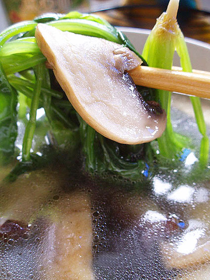 ---- 菠菜不用切,将蘑菇、香菇切片,锅里倒上油,烧热后,倒入蘑菇、香菇,炒香。