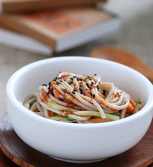 1、荞麦面入开水煮至没有硬芯。捞出即刻放冷开水浸泡。之后捞出倒香油拌匀防止你粘连。